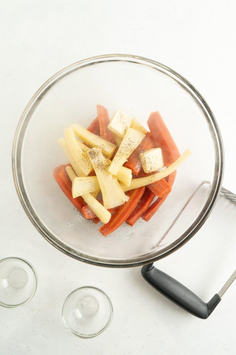 - Add the steamed carrots and parsnips to a large bowl along with the butter, salt and pepper.