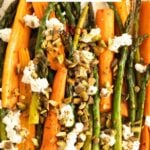 Roasted Carrots and Asparagus pair beautifully with creamy Boursin cheese and chopped pistachios. The vegetables roast until tender and lightly caramelized, then get topped with soft, herby cheese and a handful of chopped nuts for a bit of crunch. It’s a simple side dish with just enough richness and texture to make it feel special without being fussy.